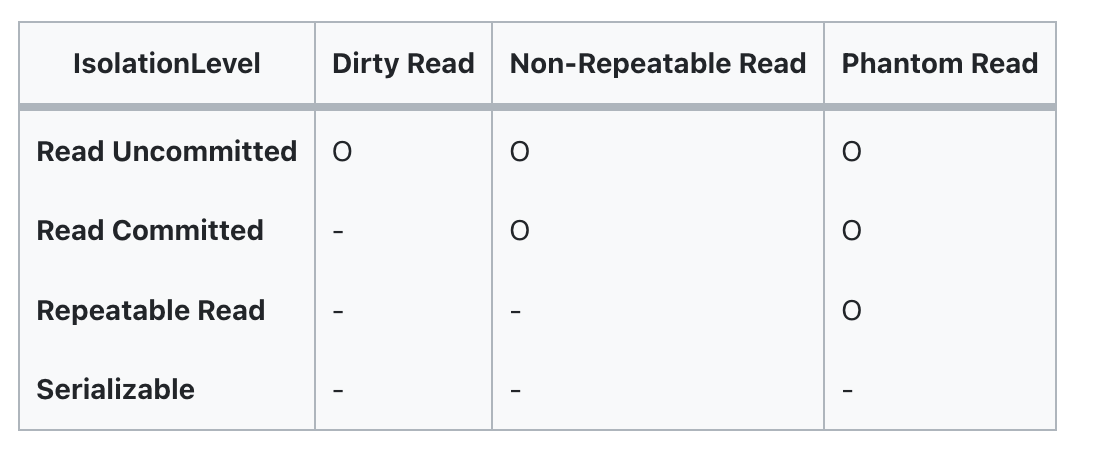 - DEFAULT : 기본 격리 수준 (기본이며, DB의 isolation level을 따른다)