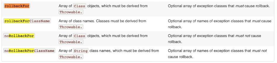 | rollbackFor=Exception.class | 특정 예외 발생시 rollback |